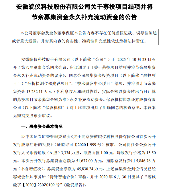 10月23日,皖仪科技(688600.SH)公告,公司第六届董事会第四次会议审议通过《关于募投项目结项并将节余募集资金永久补充流动资金的议案》。本次结项的募投项目包括“分析检测仪器建设项目”和“技术研发中心项目”,均已达到预定可使用状态,累计使用募集资金32723.76万元,预计节余募集资金13232.11万元。公司决定将节余募集资金永久补充流动资金,以提高资金使用效率。该决议无需提交股东大会审议。保荐机构国新证券股份有限公司对此出具了明确同意的核查意见。