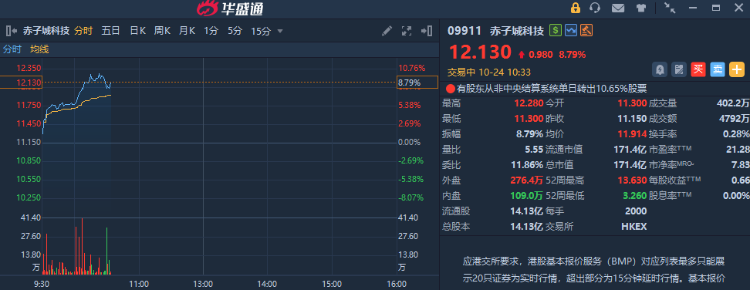 华盛资讯10月24日讯,赤子城科技早盘一度涨超10%,截至发稿,赤子城科技涨近9%,报12.13港元。