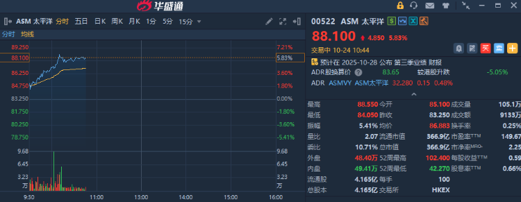 华盛资讯10月24日讯,ASM太平洋早盘股价涨近6%,现报88.10港元,成交额超9000万港元。