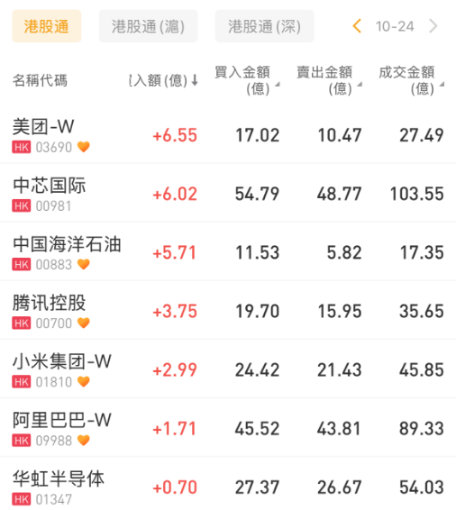 美团-W、中芯国际、中国海洋石油分别获净买入6.55亿港元、6.02亿港元、5.71亿港元;