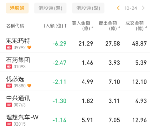 泡泡玛特、石药集团、优必选分别遭净卖出6.29亿港元、2.47亿港元、2.11亿港元。