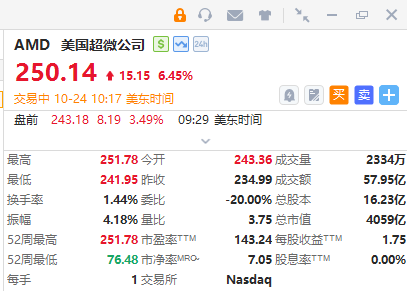 华盛资讯10月24日讯,美股芯片股盘初集体走强,AMD涨超6%创历史新高,美光科技涨超3%,博通涨超2%,台积电涨近2%,英伟达涨约1.5%;