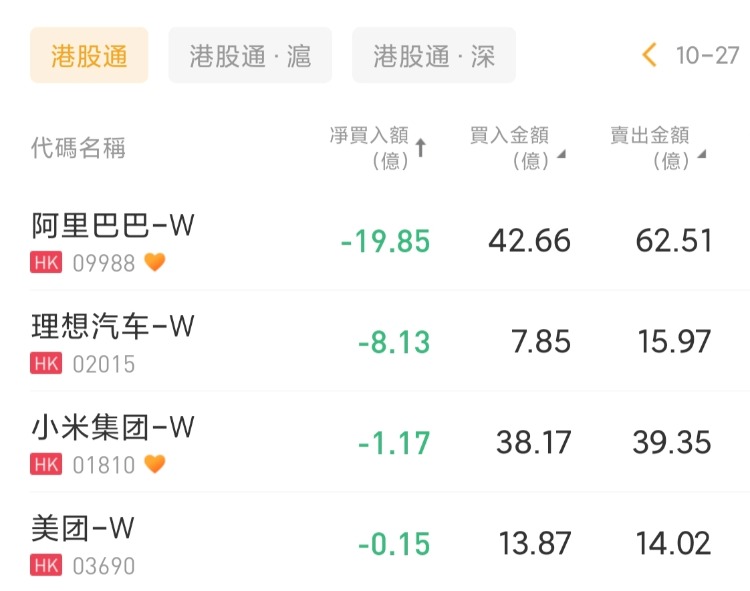 阿里巴巴-W、理想汽车-W、小米集团-W分别遭净卖出19.85亿港元、8.13亿港元、1.17亿港元。