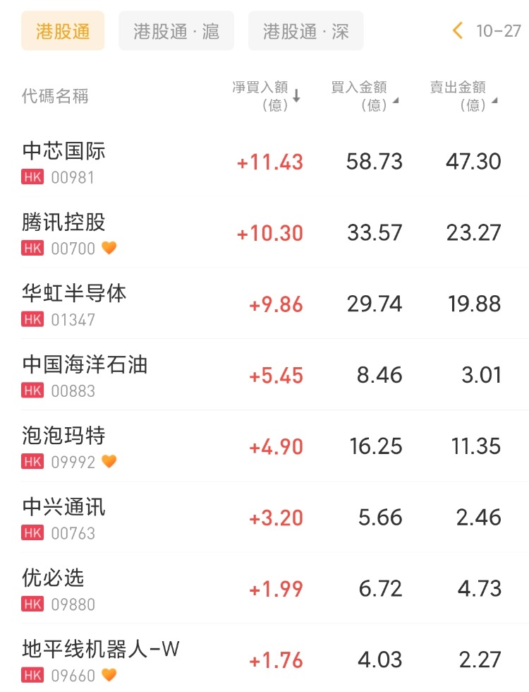 中芯国际、腾讯控股、华虹半导体分别获净买入11.43亿港元、10.3亿港元、9.86亿港元;