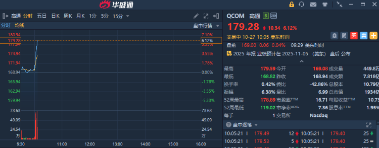 华盛资讯10月27日讯,美股半导体板块集体大涨,高通直线拉升现涨逾6%,此前推出AI芯片,在数据市场与英伟达展开竞争。