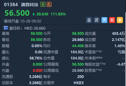 华盛资讯10月28日讯,港股滴普科技今日挂牌,截至发稿涨111.93%,报56.50港元/股,中签一手账面浮盈5968.0港元,最新总市值超184.55亿港元。一手中签率3%,需上乙组认购3329手可稳获一手。