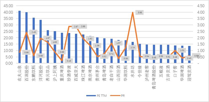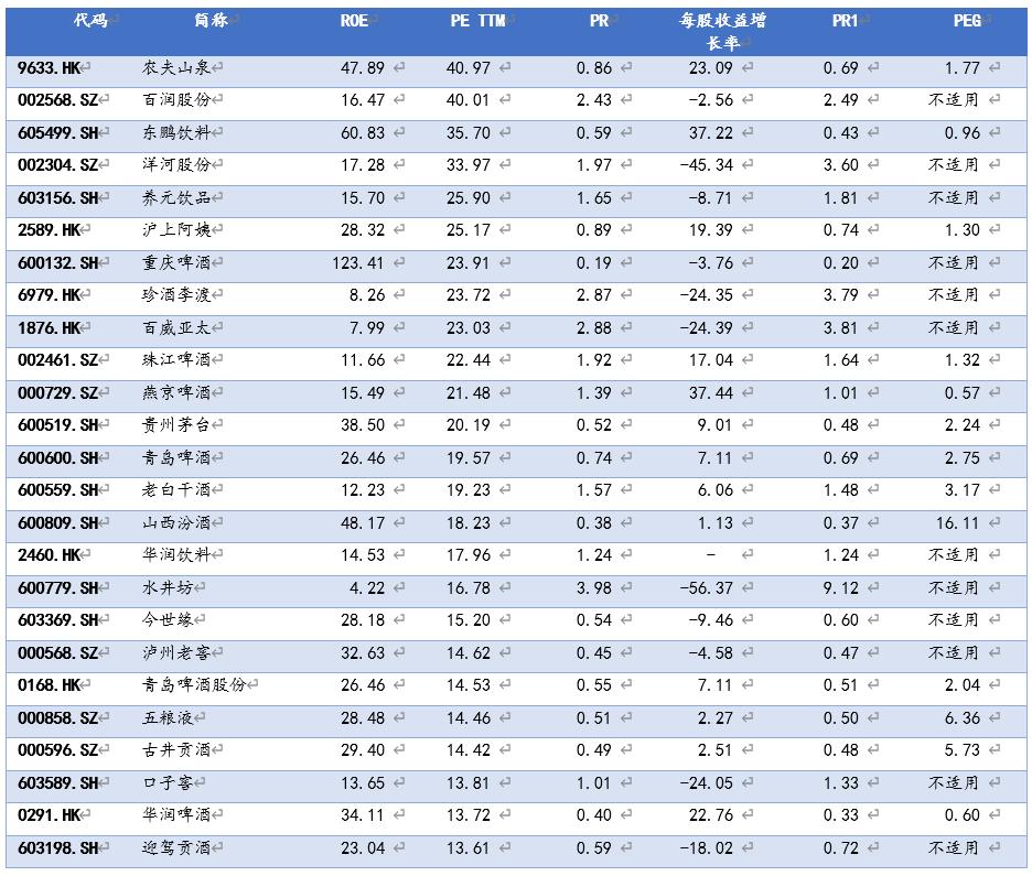 饮料行业A及H股上市公司(剔除亏损的,剔除舍得酒业等PE奇高的)PE 大多介于14倍至41倍之间,PE相对较低的是白酒股,如五粮液、茅台等,PE在30倍以上的仅东鹏、洋河及农夫山泉,其中农夫山泉最高,为40.97倍。