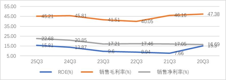 图:三季度单季ROE、销售毛利率、销售净利率表现;来源:企业财报,锦缎研究院
