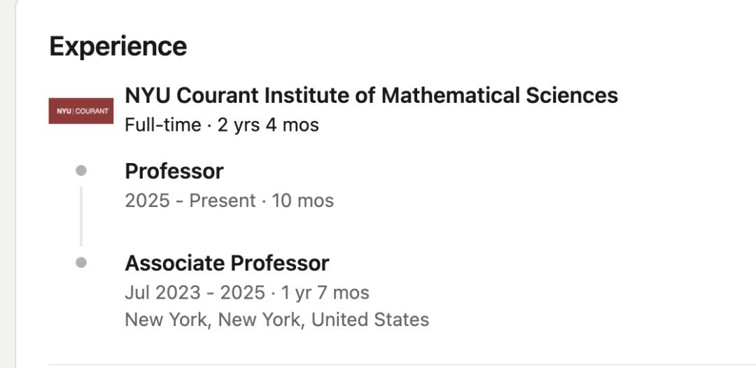 2023年,她被纽约大学科朗数学研究所聘为副教授,今年刚刚晋升为正教授。