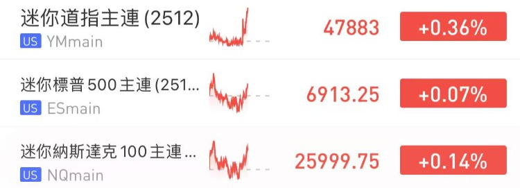 美股三大指数期货盘前上涨,纳指期货 $NQmain 涨0.14%,标普500期货 $ESmain 微涨0.07%,道指期货 $YMmain 涨0.36%。