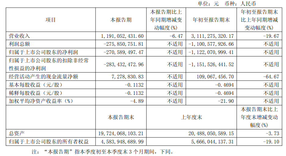 10月29日,大有能源(600403.SH)发布2025年第三季度报告,前三季度实现营业收入31.11亿元,同比下降19.67%;归属于上市公司股东的净利润为亏损11.22亿元。第三季度营业收入为11.91亿元,同比下降6.47%;归属于上市公司股东的净利润为亏损2.71亿元。业绩下滑主要原因是前三季度产品售价下降,导致营业收入和利润同比减少。