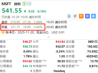 微软于美东时间10月29日盘后发布第一财季报告,公布的支出增幅超出华尔街预期,引发了市场对人工智能基础设施高成本的担忧。在周三收于541.55美元后,截至发稿,微软在盘后交易中下跌超3%。