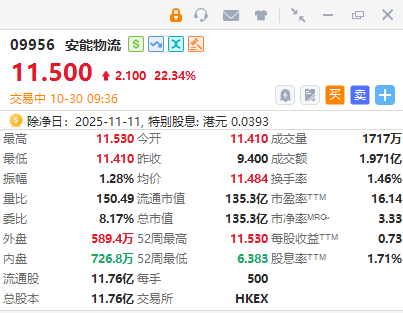 安能物流(09956)高开逾22%,截至发稿,涨21.38%,报11.41港元,成交额3064.16万港元。