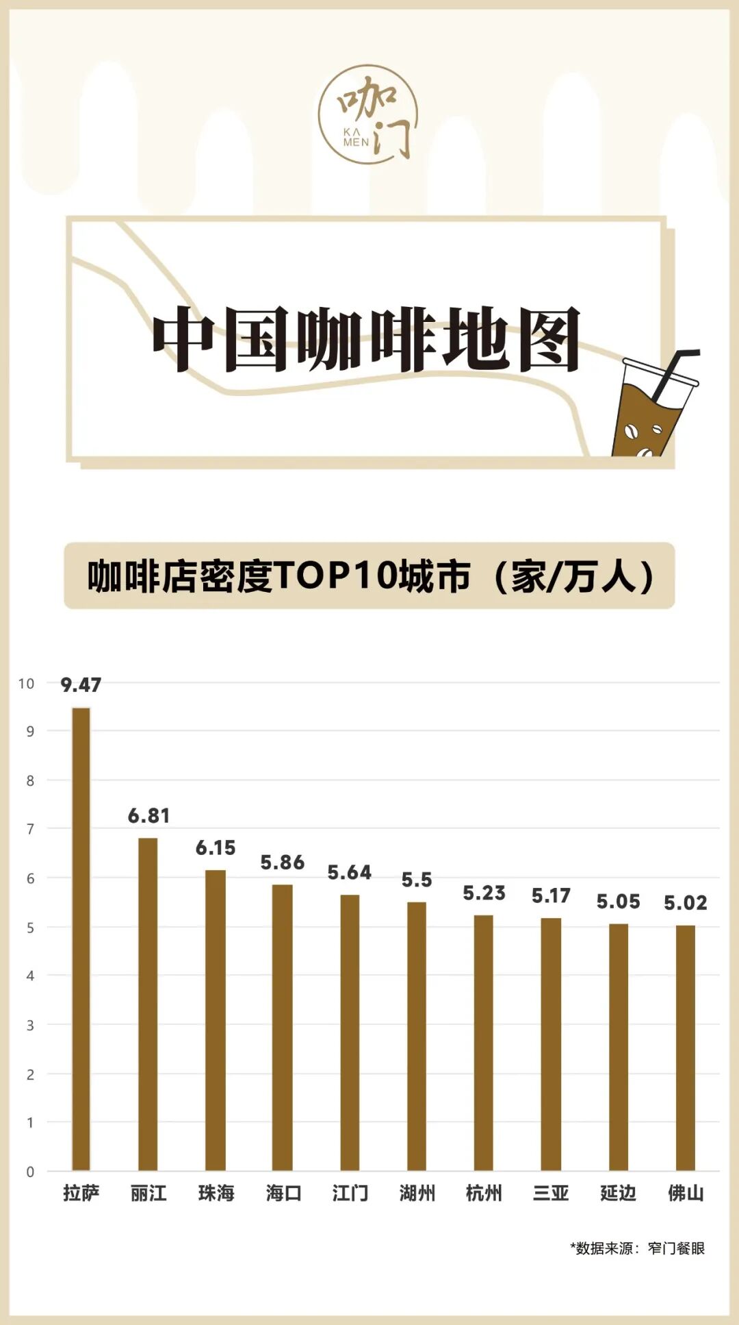 窄门餐眼统计,拉萨现有830家咖啡门店,数量不多,但对应约87万常住人口,咖啡浓度全国排名第一。