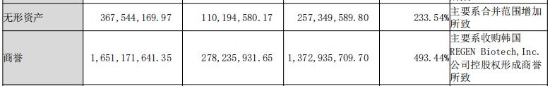 首先,爱美客商誉增加13.73亿元,同比大幅增长493.44%;其次,无形资产同比增长233.54%、固定资产同比增长47.75%,均因合并范围增加所致。