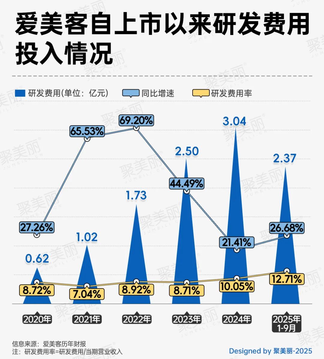医美行业核心竞争力在于产品迭代与技术壁垒。2025年1-9月,爱美客研发费用达2.37亿元,较上年同期同比增长26.68%,研发费用率提升至12.72%。