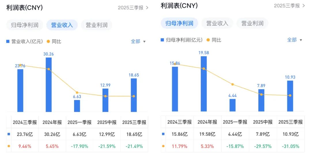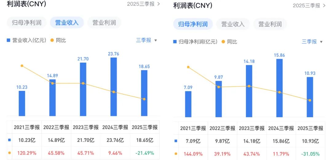报告显示,2025年1-9月期间,爱美客营利双降。其营业收入录得18.65亿元,同比下滑了21.27%;归属于上市公司股东的净利润为10.93亿元,较去年同期下降了31.05%,毛利率为93.36%。