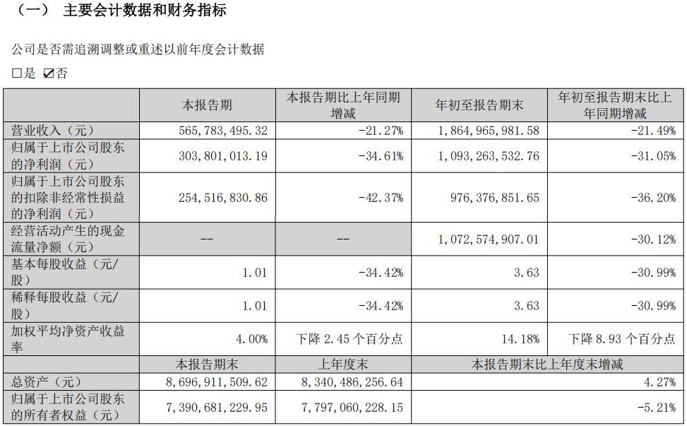 其中,第三季度营业收入为5.66亿元,同比下滑21.27%;归属于上市公司股东的净利润录得3.04亿元,同比下滑34.61%。