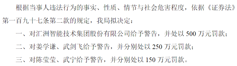 告知书显示,汇洲智能存在的违法事实为,2019年至2020年,汇洲智能的控股子公司北京热热文化科技有限公司及北京中科华世文化传媒有限公司开展虚假广告推广、著作权授权、视频审核、调研报告技术服务等业务。前述两家控股子公司通过虚构不具备商业实质的业务,2019年、2020年累计虚增收入5990.19万元、9688.56万元,分别占当期报告记载金额的5.08%、13.42%;累计虚增利润总额1415.84万元、1777.05万元,分别占当期报告记载金额的0.88%、8.72%。上述违法事实导致汇洲智能披露的2019年、2020年年报存在虚假记载。