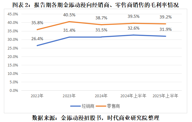 招股书显示,报告期各期,金添动漫向零售商直销的毛利率分别为35.8%、40.5%、38.7%、39.2%,近年来小幅波动。同期,金添动漫向经销商销售的毛利率分别为26.4%、31.4%、31.5%、31.9%,整体呈稳定上升趋势。