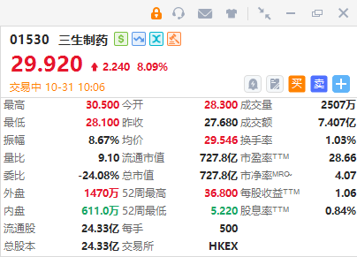 华盛资讯10月31日讯,港股创新药概念股逆市走强,三生制药大涨8%,信达生物涨超4%,歌礼制药涨超3%,先声药业、恒瑞医药涨超2%