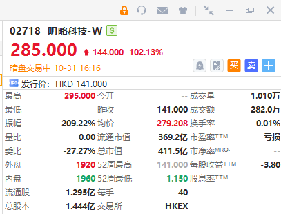 华盛资讯10月31日讯,港股明略科技-W正在暗盘交易中,截至发稿涨102.13%,报285港元/股,中签一手账面浮盈5760港元,最新总市值超400亿港元。该股预计将于11月3日正式挂牌上市,配售结果将于今日晚间披露。