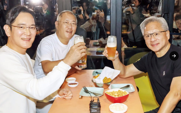 英伟达(NVDA.O)首席执行官黄仁勋近日与三星电子公司董事长李在镕,以及现代汽车公司执行董事长郑义宣,在首尔一家名为Kkanbu Chicken的当地餐馆喝啤酒、吃炸鸡的照片与视频在网络上疯传,如今投资者正纷纷追捧可能因此受益的股票。