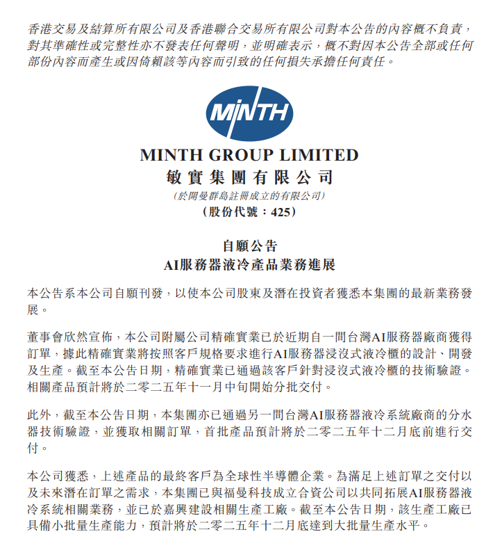 11月3日,敏实集团(00425.HK)在港交所公告,公司附属公司精确实业已于近期自一间台湾AI服务器厂商获得订单,据此精确实业将按照客户规格要求进行AI服务器浸没式液冷柜的设计、开发及生产。截至本公告日期,精确实业已通过该客户针对浸没式液冷柜的技术验证。相关产品预计将于2025年11月中旬开始分批交付。