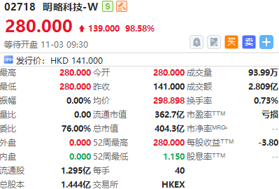 华盛资讯11月03日讯,港股明略科技-W今日挂牌,截至发稿涨98.58%,报280.00港元/股,中签一手账面浮盈5560.0港元,最新总市值超404.26亿港元。该股此前公开发售获4452.86倍认购,一手中签率1.0%。
