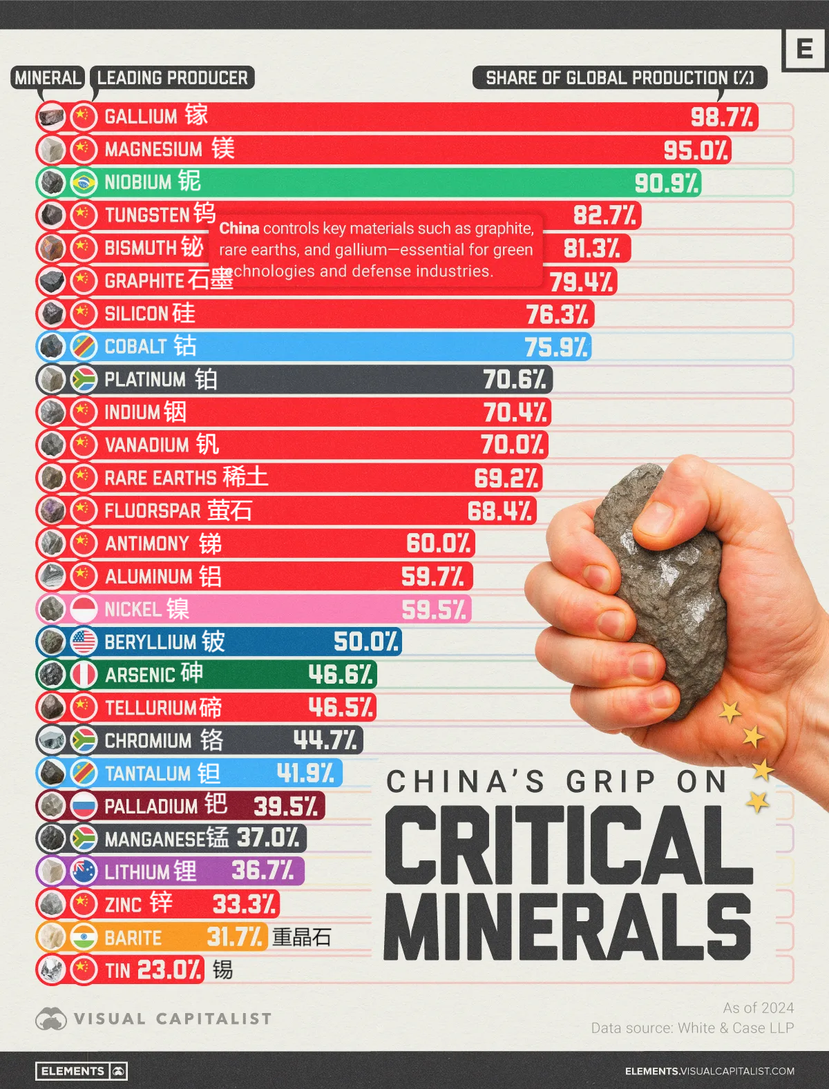其中,中国在至少15种所列关键矿产或矿产组中占据主导地位,包括镓(国内产量在全球总产量中占比达98.7%)、镁(95%)、钨(82.7%)和稀土(69.2%)。这些材料对清洁能源、国防和电子产品至关重要。