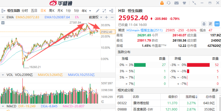 分析而言,一方面, 中美关税、十五五规划后,短期宏观利好消息落地,资金进攻意愿减弱。另一方面,美国科技股龙头财报表现分化,市场持续担心美股AI泡沫,港股景气赛道缺乏新叙事。