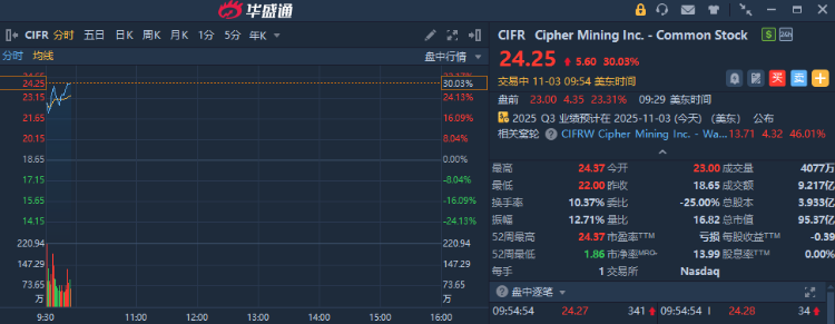 加密货币数据中心运营商Cipher Mining $CIFR 盘中涨超30%;公司公布第三季度财务业绩,并宣布与亚马逊云服务部门达成一项价值 55 亿美元、为期 15 年的合作协议。