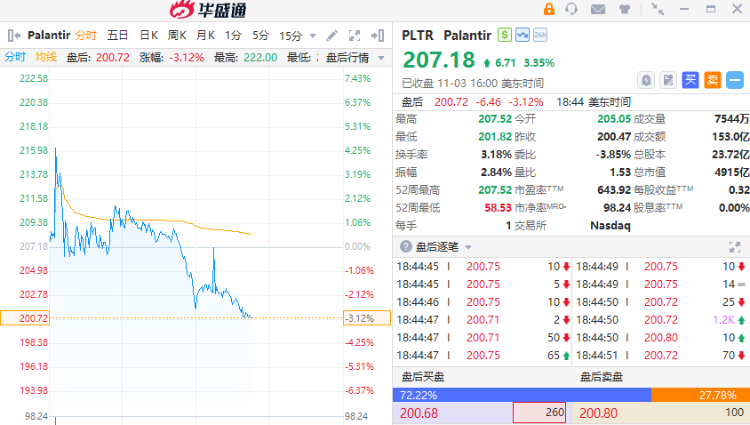 华盛资讯11月4日讯,Palantir盘后跌超3%,公司今日公布2025财年Q3业绩,公司Q3营收11.81亿美元,同比增长62.7%,超过了华尔街预计的10.9亿美元;股权持有人应占溢利4.76亿美元,同比增长230.6%。