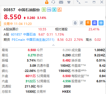 此外,里昂发表报告指,中石油第三季业绩显示,公司可在油市波动下交出稳定及坚韧的盈利。中石油股息展望及股息稳定性为同业中最佳。该行对中石油H股目标价由8.6港元上调至8.8港元,A股目标价由11.9元上调至12元,重申“跑赢大市”评级,视为三桶油中首选。
