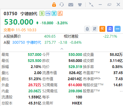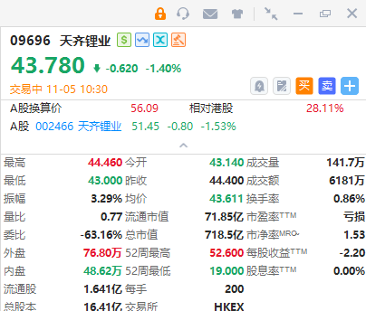 锂业股今早继续走低,截至发稿,宁德时代跌超3%,赣锋锂业跌3.33%,报45.92港元;天齐锂业跌1.4%,报43.78港元
