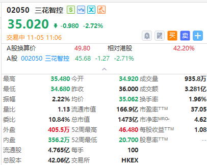 三花智控(02050)再跌近3%,截至发稿,跌2.72%,报35.02港元,成交额3.281亿港元。