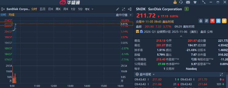 华盛资讯11月5日讯,美股数据存储概念股走强,Sandisk $SNDK 、希捷科技盘中涨超8%,美光科技涨超6%,西部数据涨超5%。