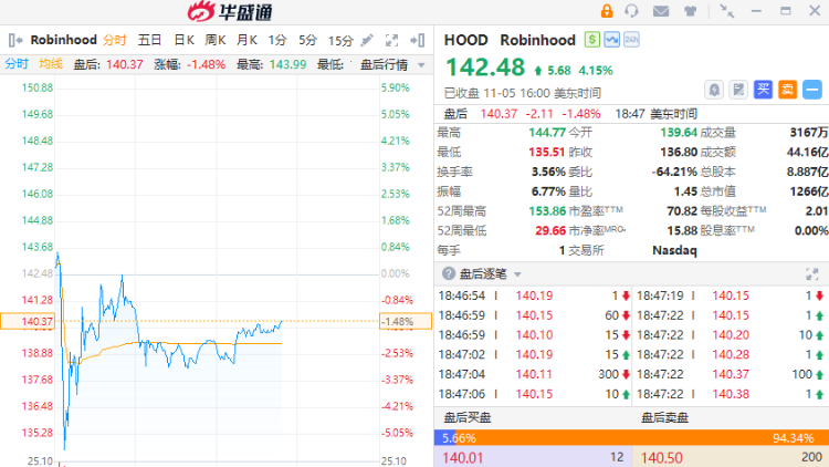 截至发稿时,Robinhood股价盘后下跌1.74%,至140美元。值得注意的是,该股今年以来已累计上涨近四倍,此前在第三季度被纳入标普500指数的利好消息进一步推高了股价。