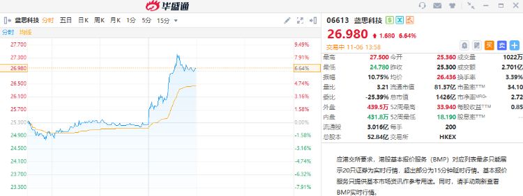 蓝思科技涨超6%,截至发稿,涨6.64%,报26.98港元,成交额2.701亿港元。