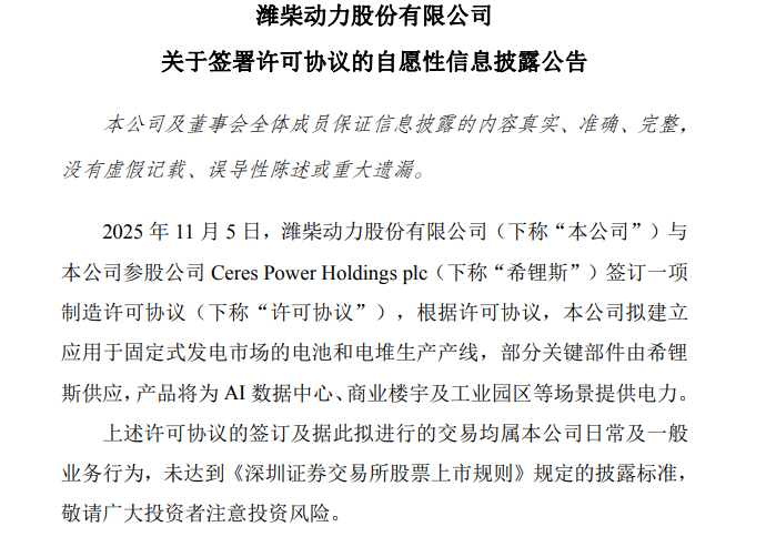 11月6日,潍柴动力(000338.SZ)发布公告显示,公司与参股公司Ceres Power Holdings plc签订制造许可协议,拟建立应用于固定式发电市场的电池和电堆生产产线,产品将为AI数据中心、商业楼宇及工业园区等场景提供电力。该协议属公司日常及一般业务行为,未达到披露标准。