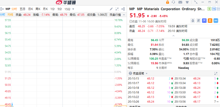 华盛资讯11月7日讯,稀土公司MP Materials夜盘跌超7%,今日公布2025财年Q3业绩,Q3营收0.54亿美元,同比下降14.3%,股权持有人应占亏损0.42亿美元,同比亏损扩大61.5%。