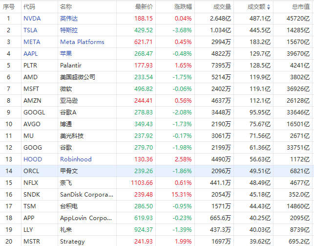 第3名Meta Platforms收高0.45%,成交183.2亿美元。该公司周五发布公告,确认该公司将于2028年前在美国投资6000亿美元,用于建造人工智能数据中心等基建和人才招募等。