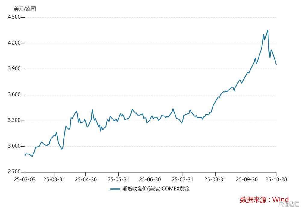 今年黄金涨势凌厉,仅用了七个月,国际金价便从3000美元/盎司飙至4000美元/盎司。10月20日,COMEX黄金刷出4398美元/盎司的历史峰值后,次日晚间即重挫5.07%,创上市以来单日最大跌幅;随后颓势延续,至10月29日已跌破4000美元/盎司关口,8个交易日内回撤近10%。