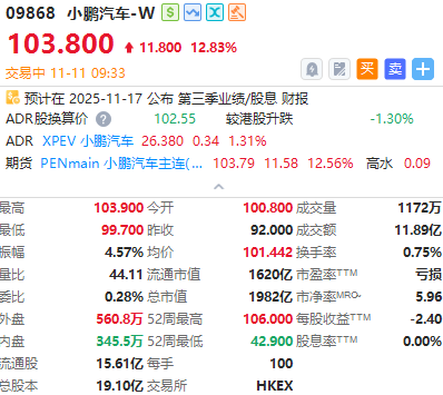 华盛资讯11月11日讯,港股小鹏汽车高开高走,截至发稿,涨近13%,报103.8港元,成交额11.89亿港元。
