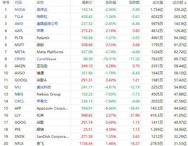 第13名Nebius收跌7.03%,成交47.77亿美元。这家荷兰AI云服务提供商公布了营收激增超三倍的第三季度业绩,同时该公司还宣布,已与Meta签署一份价值约30亿美元的五年期合作协议,为这家Facebook母公司提供AI基础设施服务。
