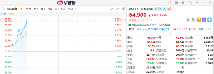 京东健康涨超5%,截至发稿,涨5.61%,报64.9港元,成交额2.265亿港元。