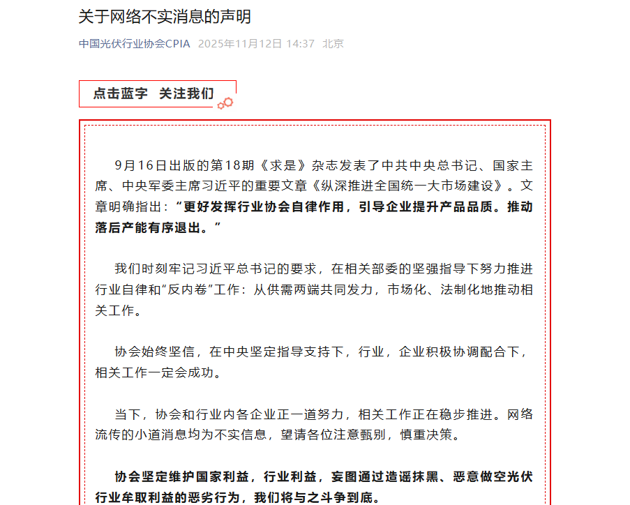 11月12日,中国光伏行业协会官微发布声明称,协会始终坚信,在中央坚定指导支持下,行业,企业积极协调配合下,相关工作一定会成功。当下,协会和行业内各企业正一道努力,相关工作正在稳步推进。网络流传的小道消息均为不实信息,望请各位注意甄别,慎重决策。协会坚定维护国家利益,行业利益,妄图通过造谣抹黑、恶意做空光伏行业牟取利益的恶劣行为,我们将与之斗争到底。