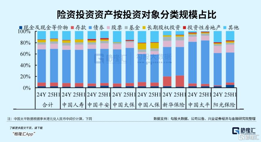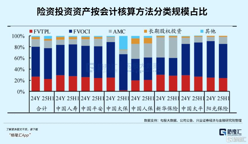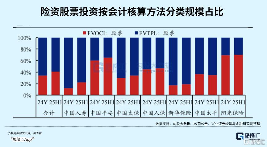 根据机构,2025年上半年,各险企股票FVTPL占比分别为:新华保险81%、中国人寿77%、中国太保66%、中国人保54%、中国平安35%。