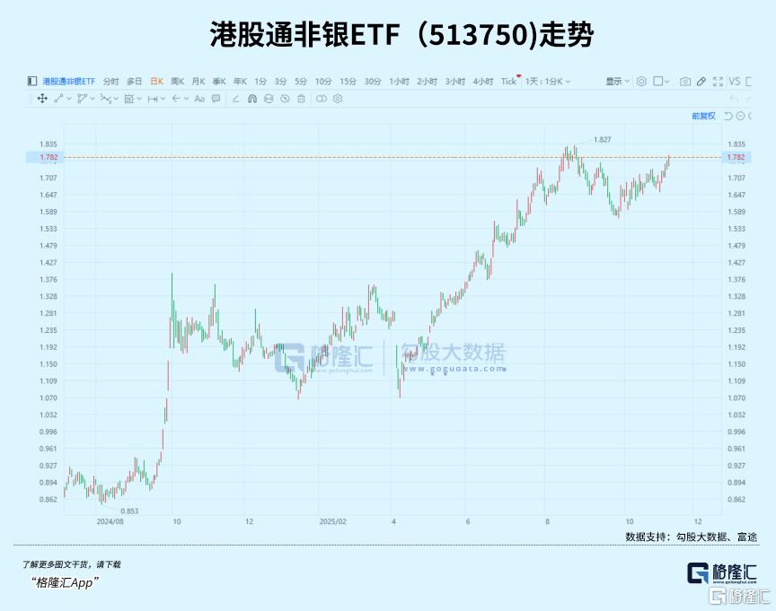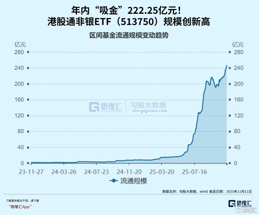 港股通非银ETF(513750)昨天单日获资金净买入6.46亿元,净买入额在全市场ETF中居首,其已连续9个交易日持续获资金净买入,年内累计获资金净买入222.25亿元,最新规模达246.54亿元,再创历史新高。