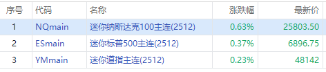 美国众议院今日投票临近,或有望结束历史上最长政府停摆;美股三大期指盘前集体走高,截至发稿,纳指期货 $NQmain 涨0.63%,标普500期货 $ESmain 涨0.37%,道指期货 $YMmain 涨0.23%。